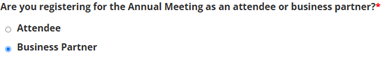 Select “Business Partner” when asked “Are you registering for the Annual Convention as an attendee or business partner?”