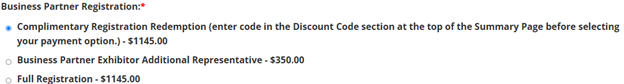 Under the Registration Details and Preferences Section, you will select “Complimentary Registration Redemption” as your Business Partner Registration.